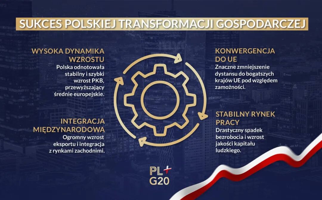 这张图强调:波兰通过高速经济增长、与欧盟趋同、国际化融合以及稳定的就业市场,实现了成功的经济转型。