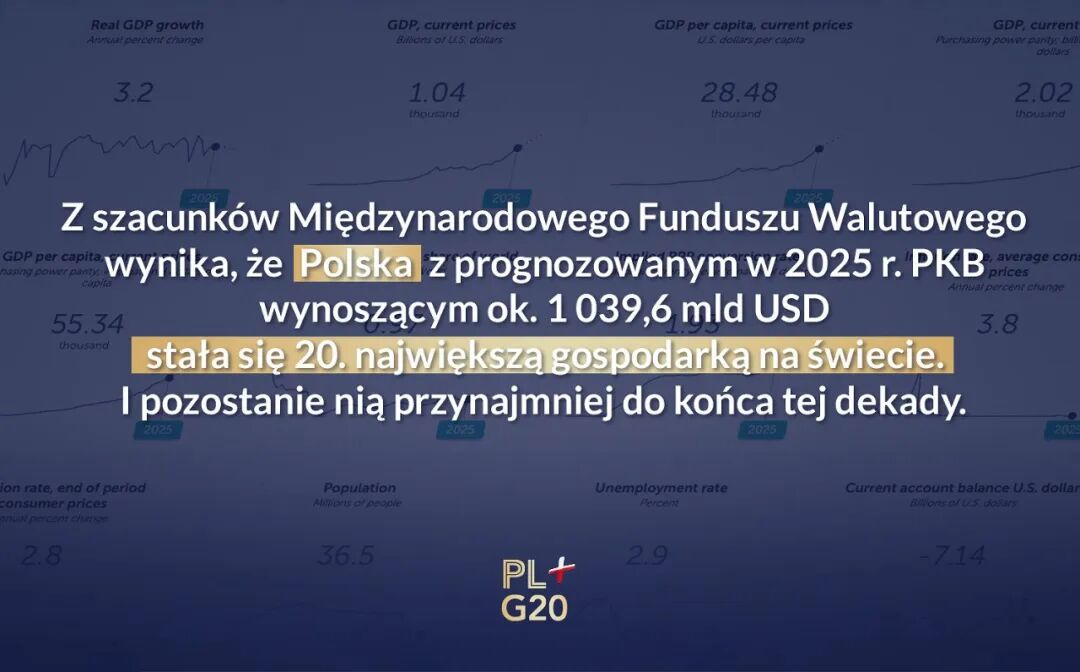 根据国际货币基金组织(IMF)的估算,波兰的国内生产总值(GDP)在2025年底将达到10,396亿美元,成为世界第20大经济体,并且至少在十年内保持这一地位。