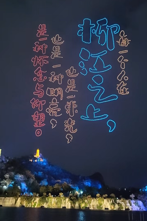 3000架無人機在柳江邊騰空而起,將獲獎作品中的經典詞句與廣西標誌性地標意象在天幕上徐徐鋪展。此外,“夜廣西”心動美文牆、“夜廣西”美文互動球、“三姐伴遊”AI線路生成體驗區、“我AI廣西夜”光影互動站等,以“文學+夜遊+科技”打造互動場景和傳播記憶。