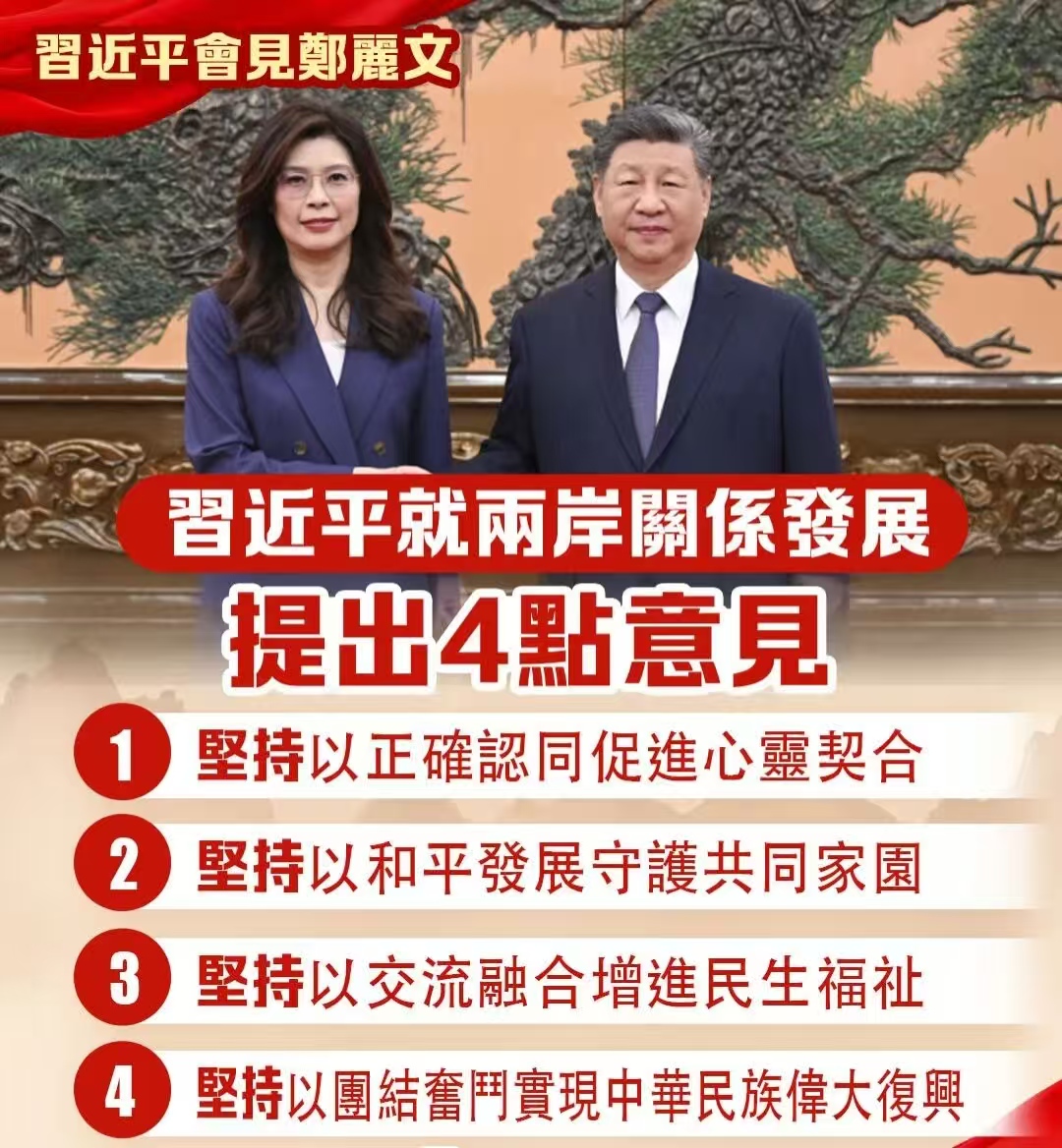 習近平就兩岸關係發展提出4點意見,堅持以正確認同促進心靈契合;堅持以和平發展守護共同家園;堅持以交流融合增進民生福祉;堅持以團結奮鬥實現中華民族偉大復興。