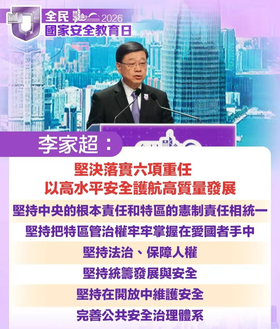 行政長官李家超表示,香港國安法與《維護國家安全條例》有效堵塞了國家安全漏洞,但社會上仍經常出現「軟對抗」,仍有不少敵對勢力伺機抹黑攻擊香港,我們必須時刻警惕、長期警惕。他強調,特區政府會以高水平安全護航高質量發展,堅決落實六項重任,又指要團結奮鬥、群策群力,編制好首個香港五年規劃,精準對接「十五五」規劃,統籌好發展和安全。