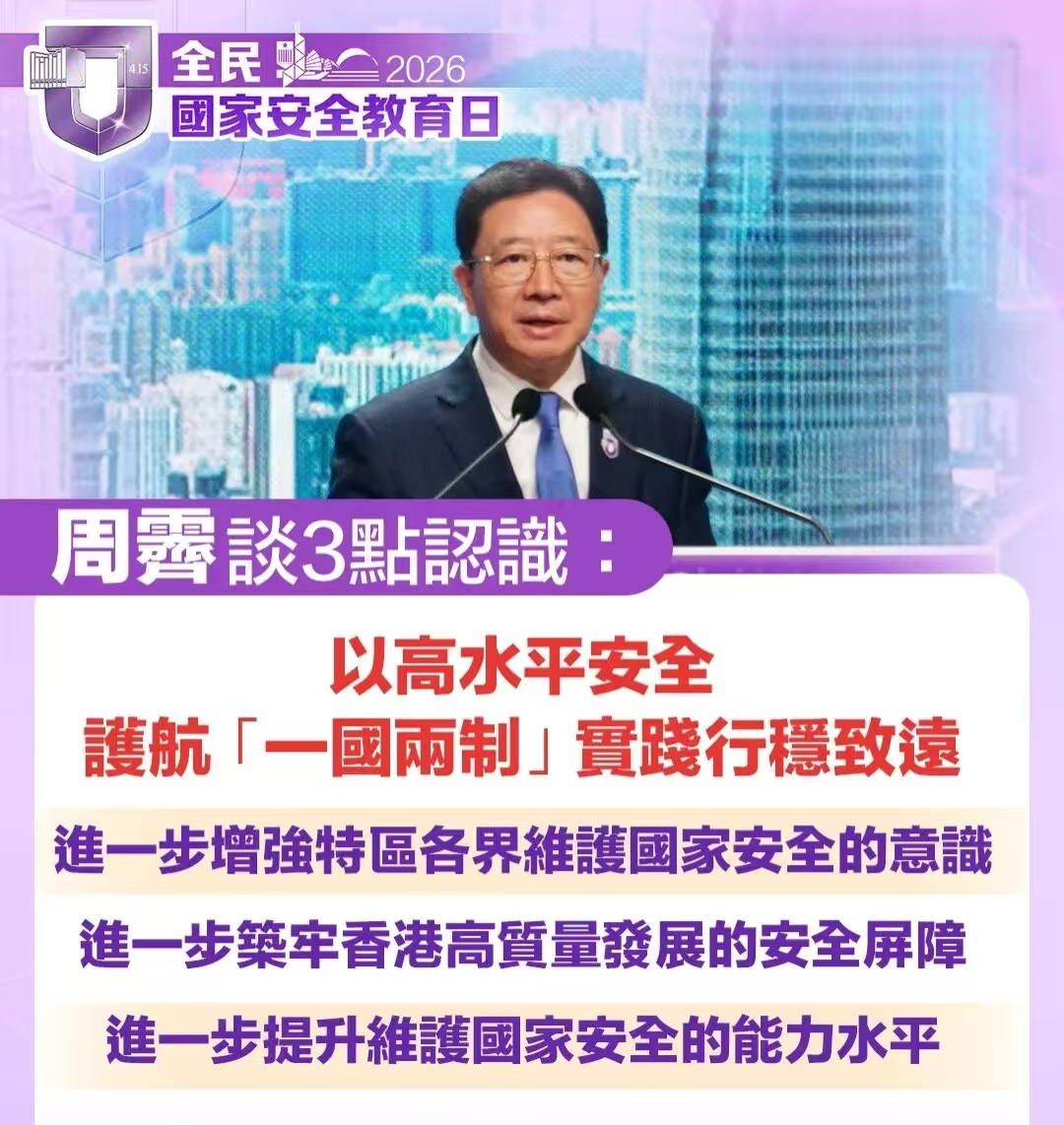 中央人民政府駐香港特別行政區聯絡辦公室主任、香港特區維護國家安全委員會國家安全事務顧問周霽分享了三點認識。