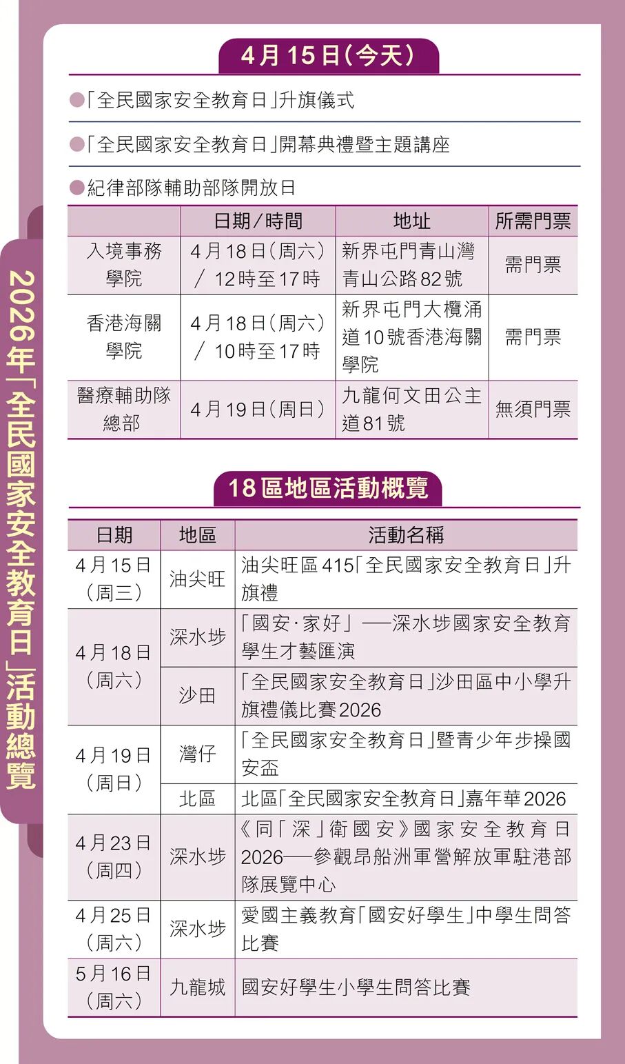 4月15日),是第11個全民國家安全教育日。早上,保安局帶領轄下紀律部隊在香港警察學院聯合舉行升旗儀式。