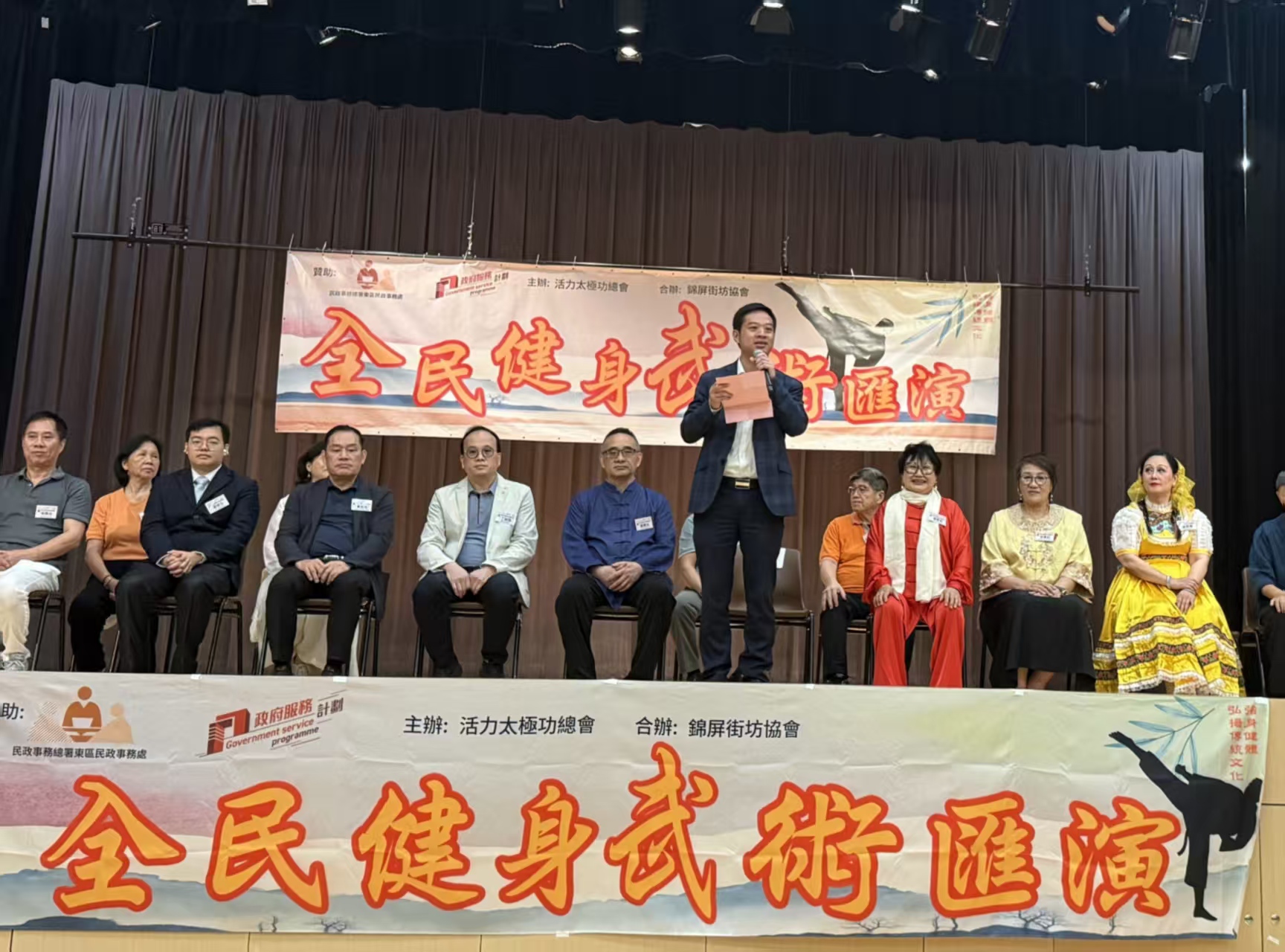丁錦聰會長代表協辦方錦屏街坊協會致辭,感謝民政事務署及主辦方活力太極功總會,尤其嚴主席帶領團隊凝聚各方力量,促成這台以武會友、以武聚力的盛會。他指中華武術承載尚武崇德、剛柔並濟的精神,協會一直致力豐富街坊生活、拉近鄰里距離,期望活動能讓傳統文化魅力深入社區。