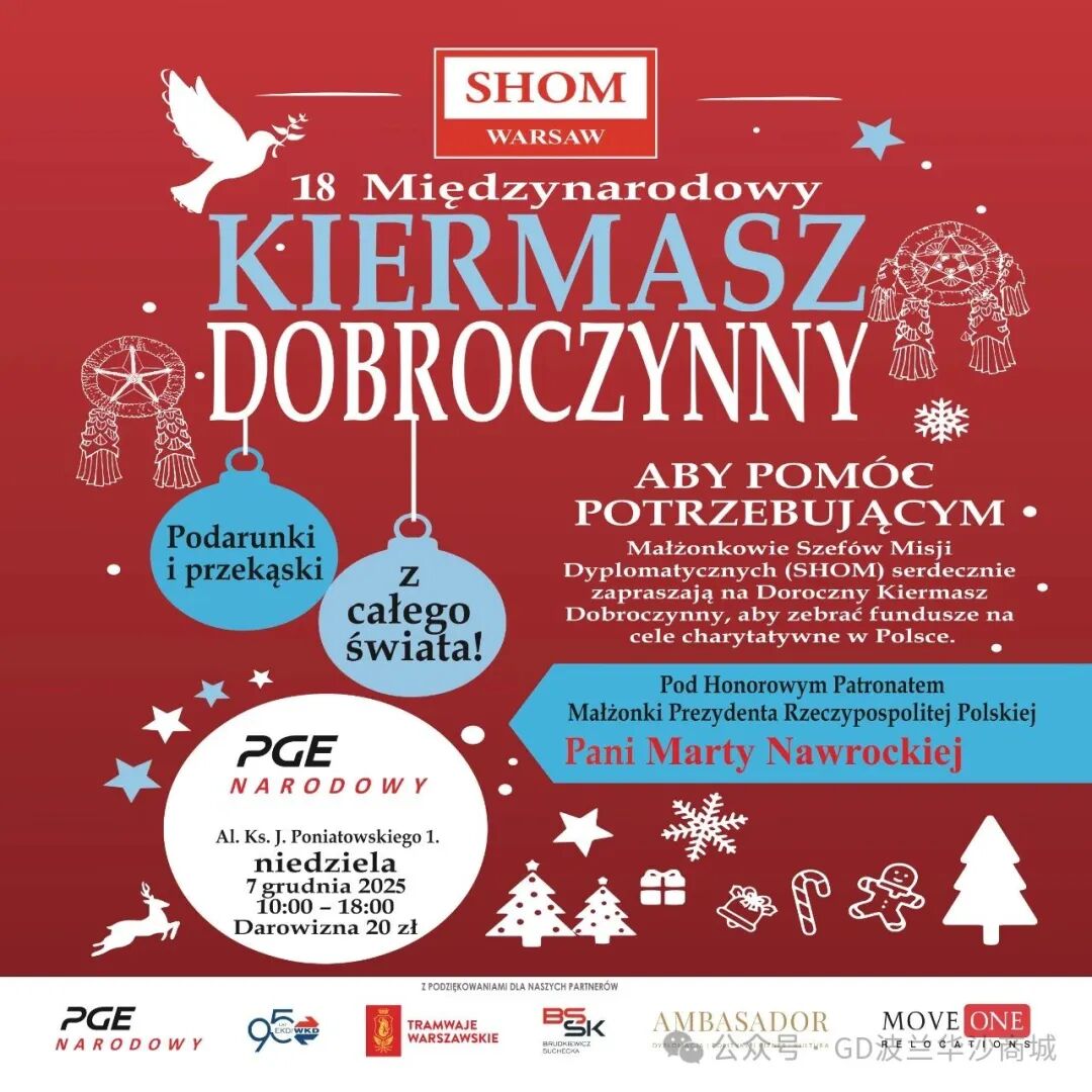12月7日,华沙 PGE 国家体育场暖意融融,第十八届国际 SHOM 慈善义卖会在此盛大启幕。作为由波兰第一夫人玛尔塔・纳夫罗茨卡首次担任荣誉赞助人、各国外交使团团长配偶协会主办的年度慈善盛会,本次活动以 “帮扶波兰贫困民众” 为核心使命,吸引了 60 多个国家的参展方齐聚一堂。而在这场跨国公益盛宴中,波兰青田同乡会携手 GD 商城、波兰华人社团主动牵头,以鲜明的组织担当、深厚的文化情怀,成为中国展台的核心力量,为慈善事业注入温暖的华人力量。