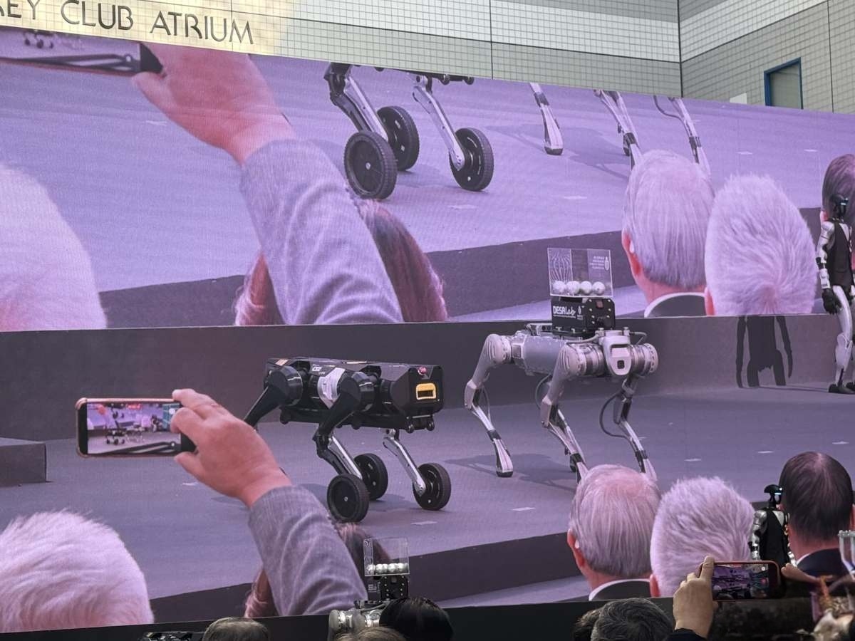 啟動儀式另有一大亮點,就是為主禮嘉賓呈上啟動「奇跡球」的任務落在了兩隻機械狗身上,這兩款機械狗分別由科大初創企業本未科技、土木及環境工程學系,以及鄭家純機器人研究院共同研發,這些四足機械助手原為應對複雜地形及高風險工業檢測而研發。