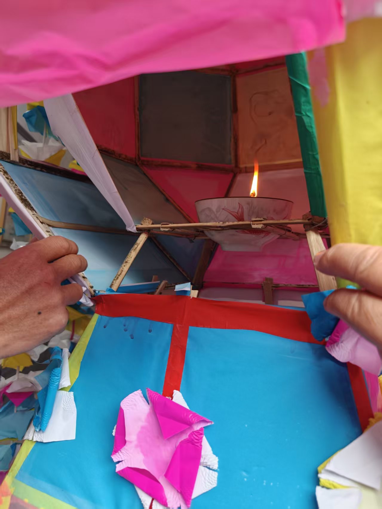 過去一年高懸的舊燈,爭相摘取燈上的裝飾紙花。按古老傳統,將搶得的花帶回家中置於床頭,寓意祈求人丁興旺。