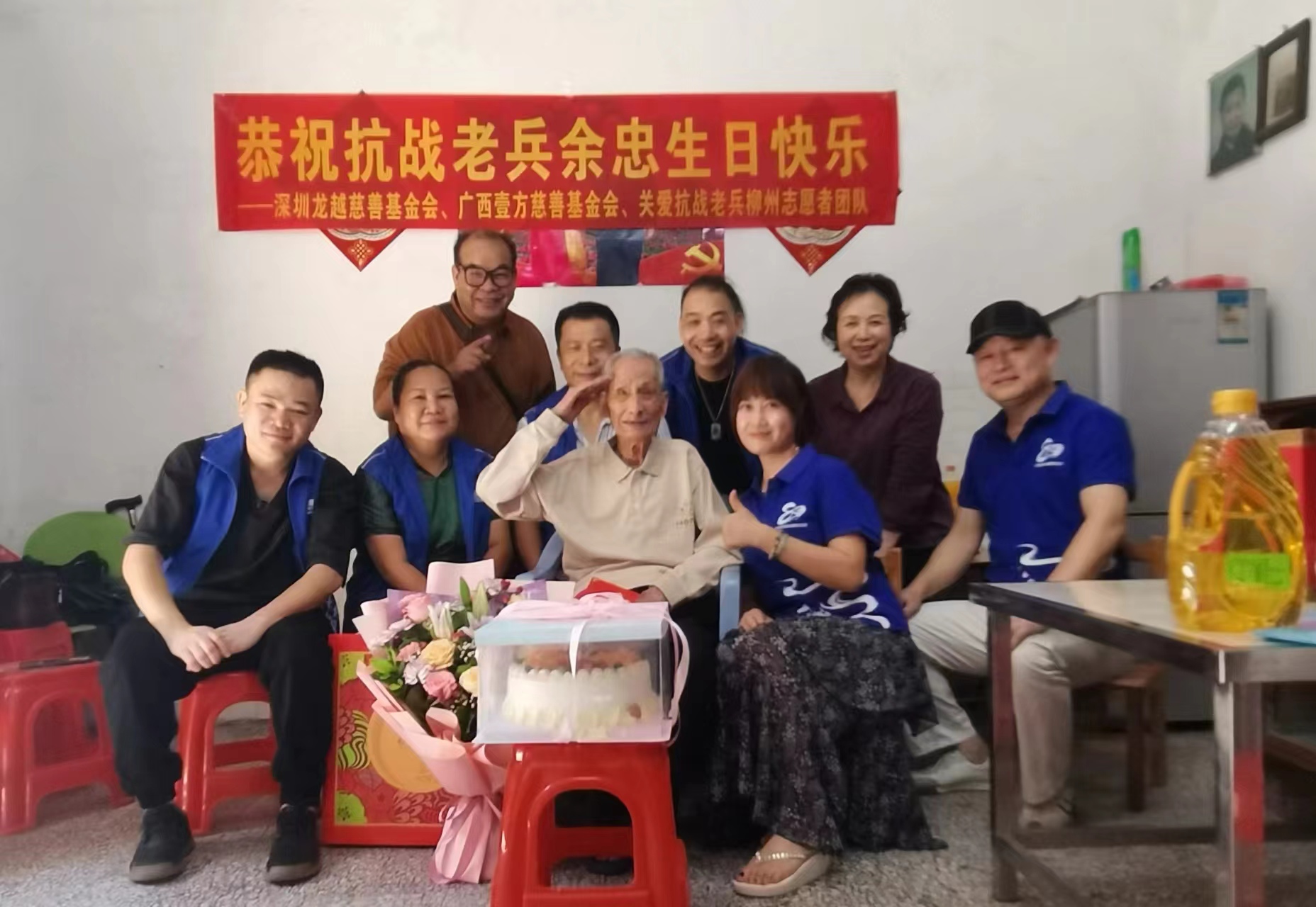 这天,志愿者们带来了广西爱心企业的中秋礼包和深圳龙越慈善基金会、广西壹方慈善基金会、关爱抗战老兵公益基金等三家机构的慰问金,还有关爱抗战老兵柳州志愿者团队亲手做的生日贺卡。“余爷爷,祝您