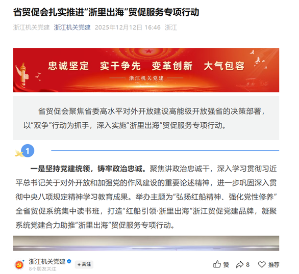 我们还积极将“浙里出海”品牌融入贸促系统在境内外举办的各类经贸活动中,品牌IP效应日益凸显。各地市贸促会特色品牌如“红帆聚力·甬通全球”、“浙里出海·舟到服务”等竞相涌现,形成了党建品牌与业务品牌同频共振、相互促进的良好局面。