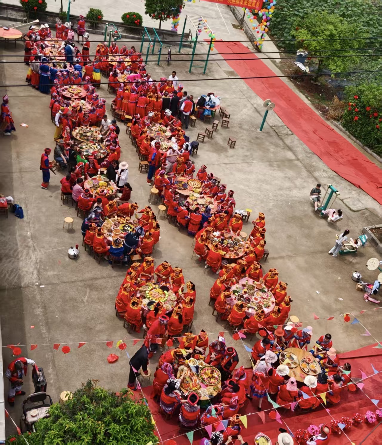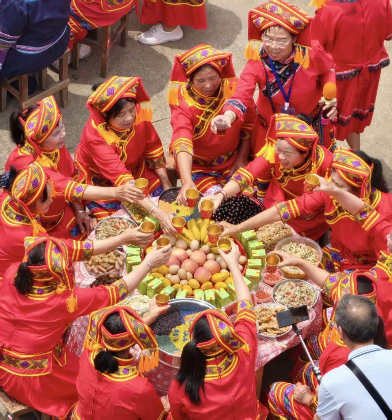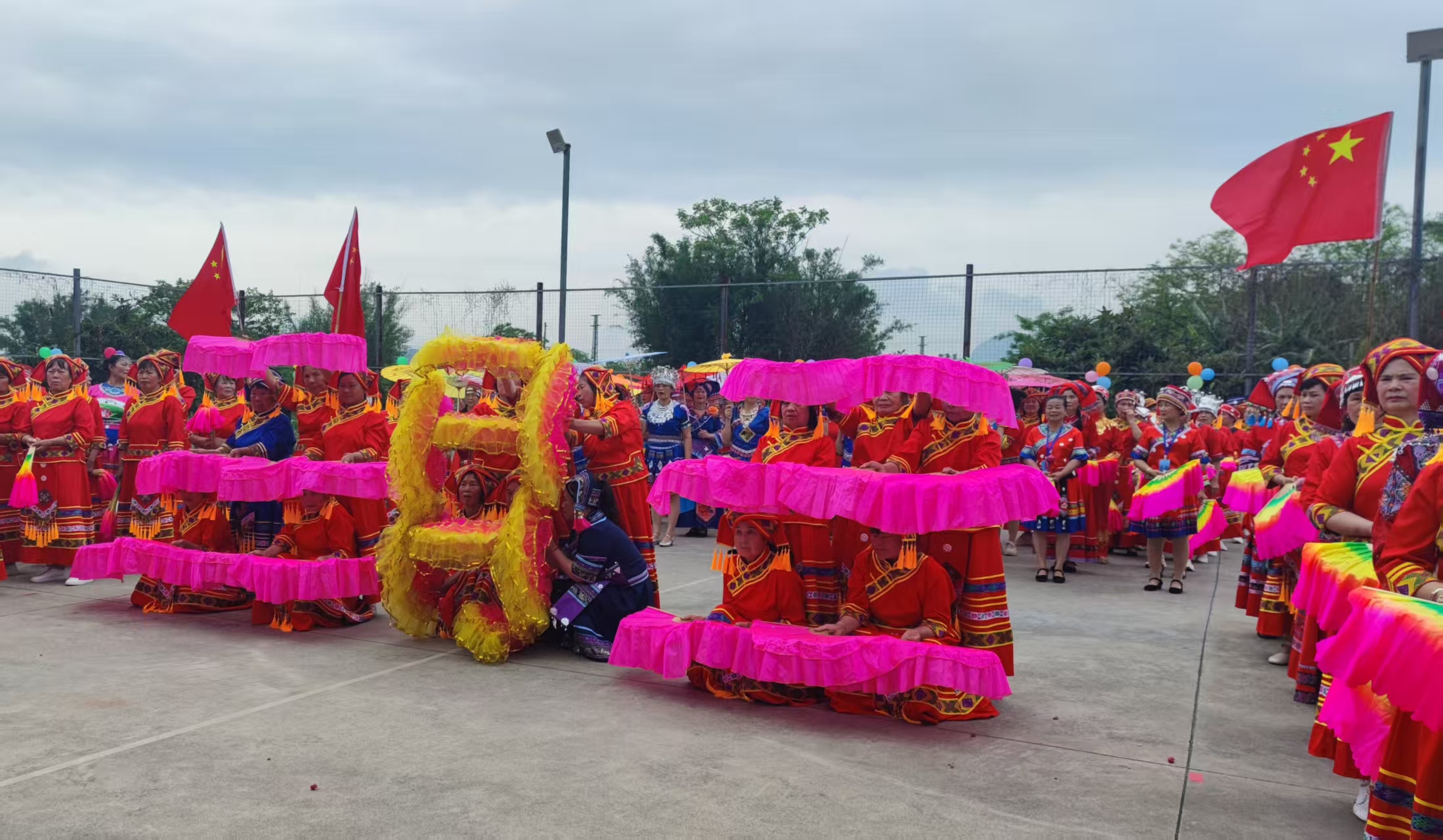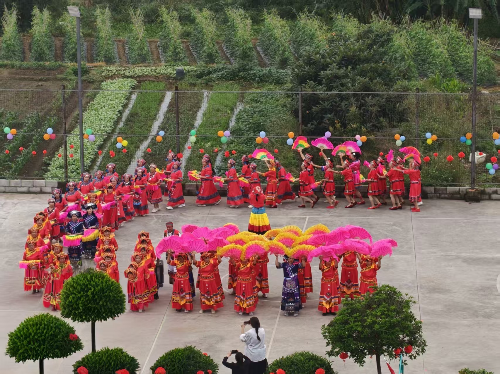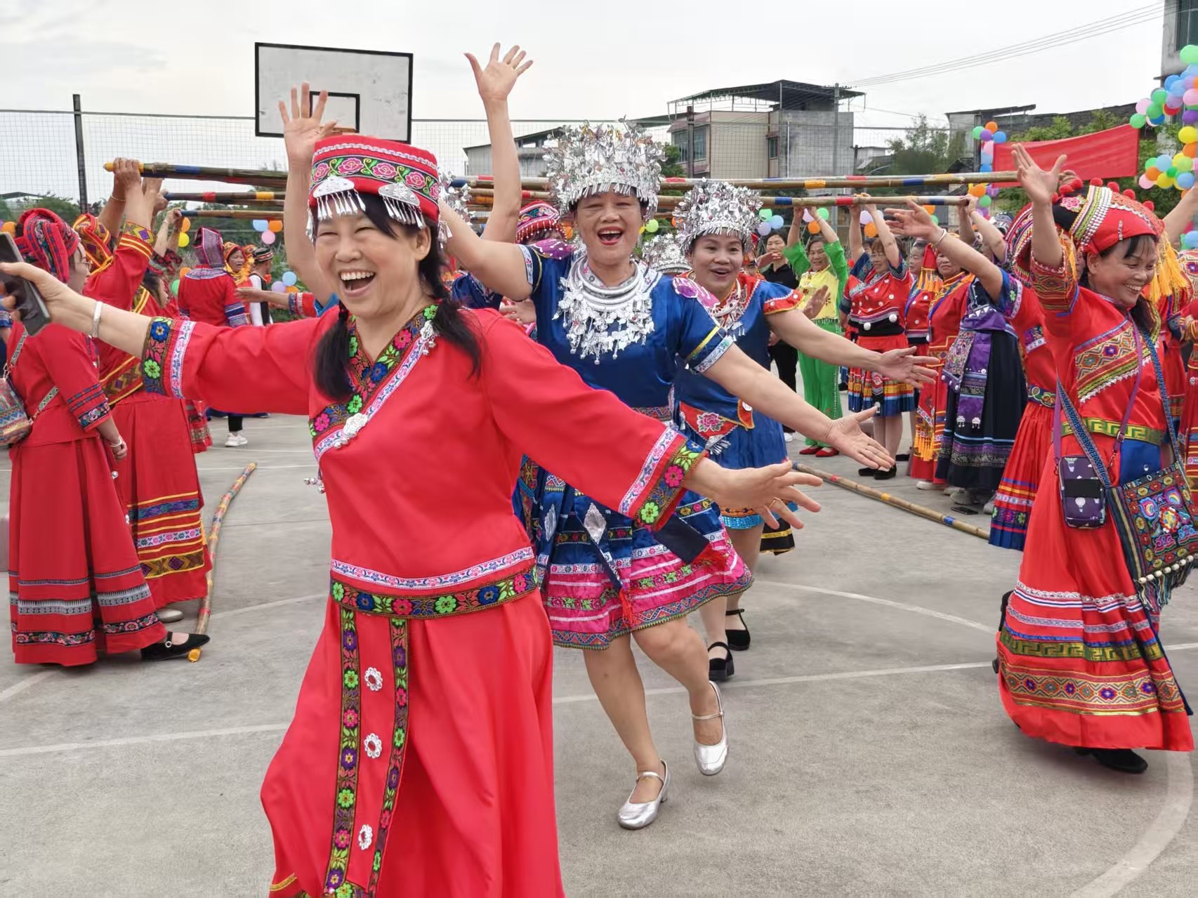 山歌余韵未落,音乐已响彻球场。数百名队员身着绚丽民族服饰步入篮球场,宛如移动的画卷,吸引众多市民拍照记录。