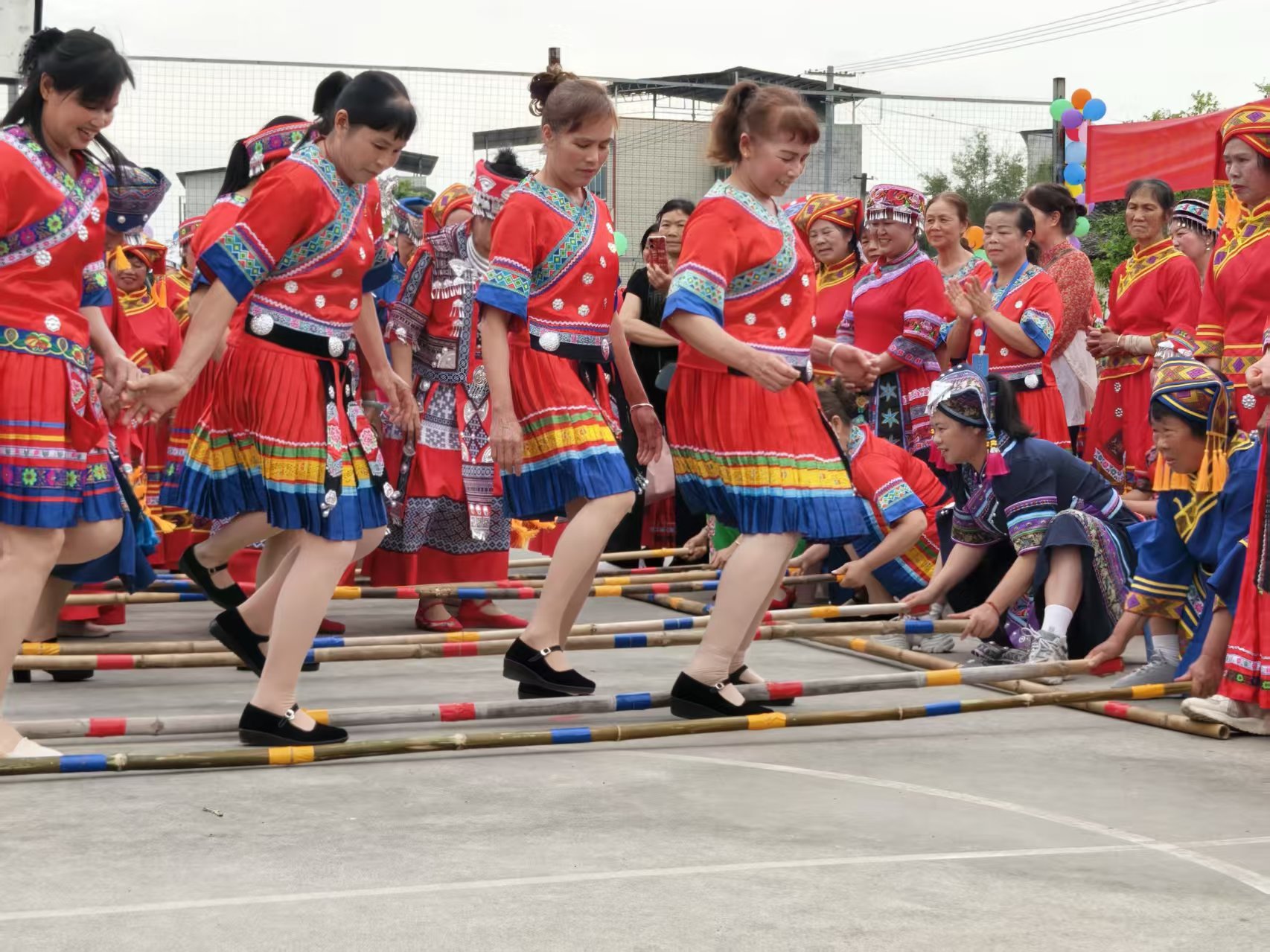 随后,富有壮族特色的竹竿舞登场。竹竿开合清脆,舞者轻盈跃动,围观群众掌声不断。无论是否被竹竿