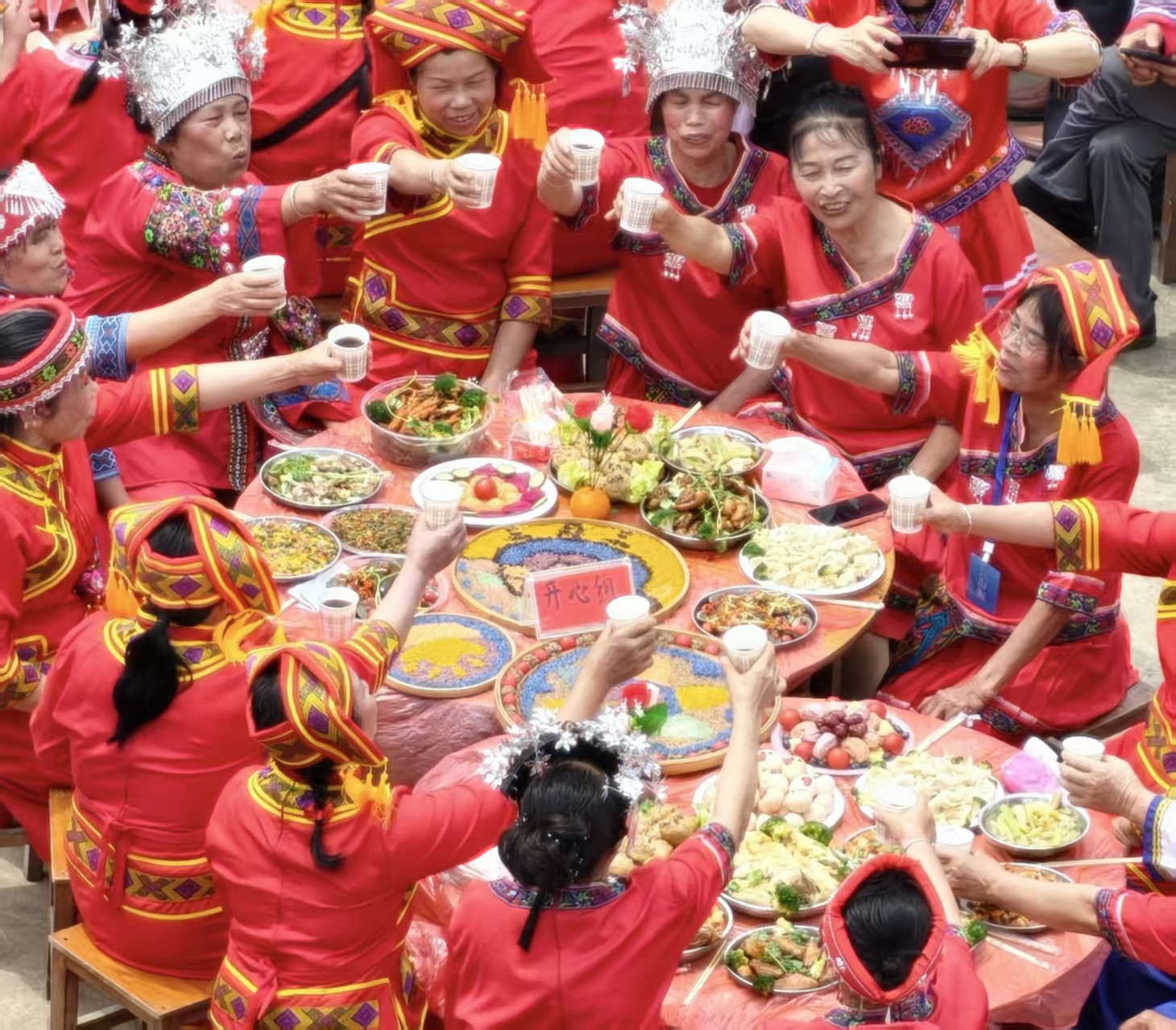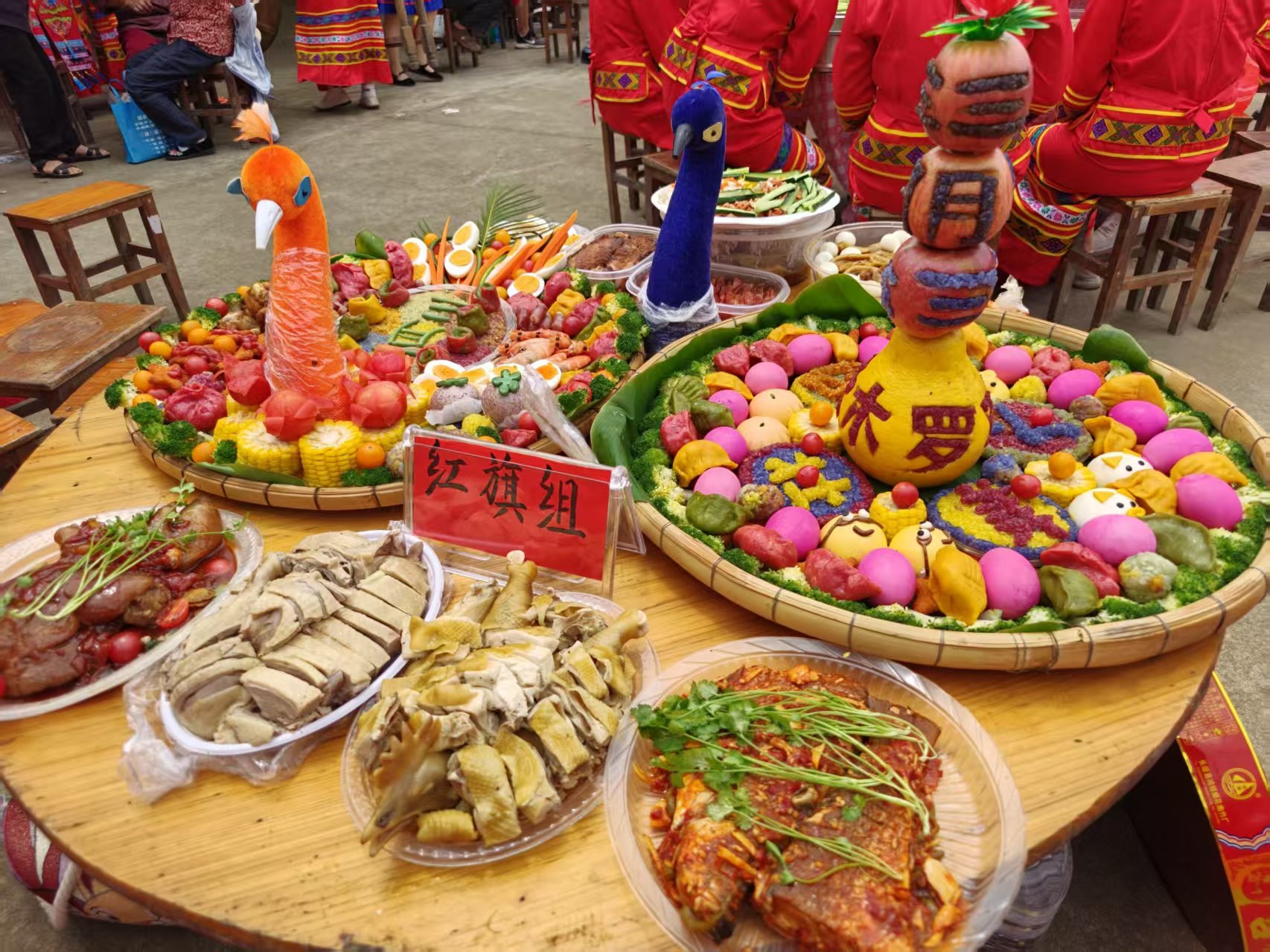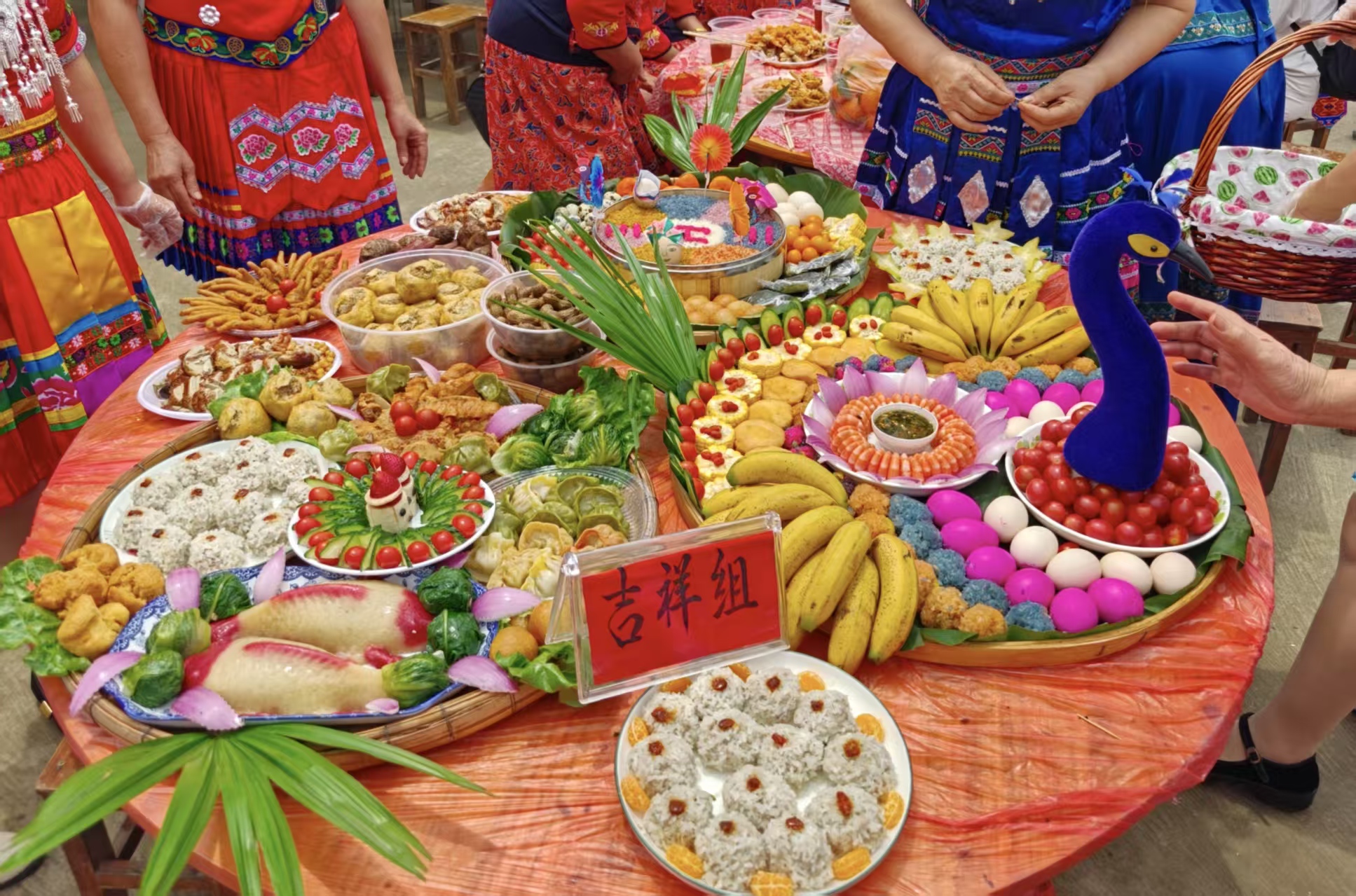 “摆长桌宴”。17个群组纷纷端出创意美食:五彩糯米饭是“标配”,水果、香肠等食材更被巧手拼成“三月三”“星辰大海”“洋洋得意”等造型。