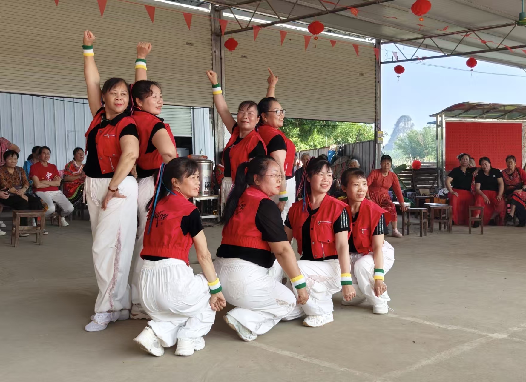 随着《歌唱祖国》旋律响起,全场齐跳广场舞,场面庄重而震撼;《吉祥》乐声一起,队员们或撑伞、或挥扇,围成圈圈欢快起舞,将气氛推向首个高潮。